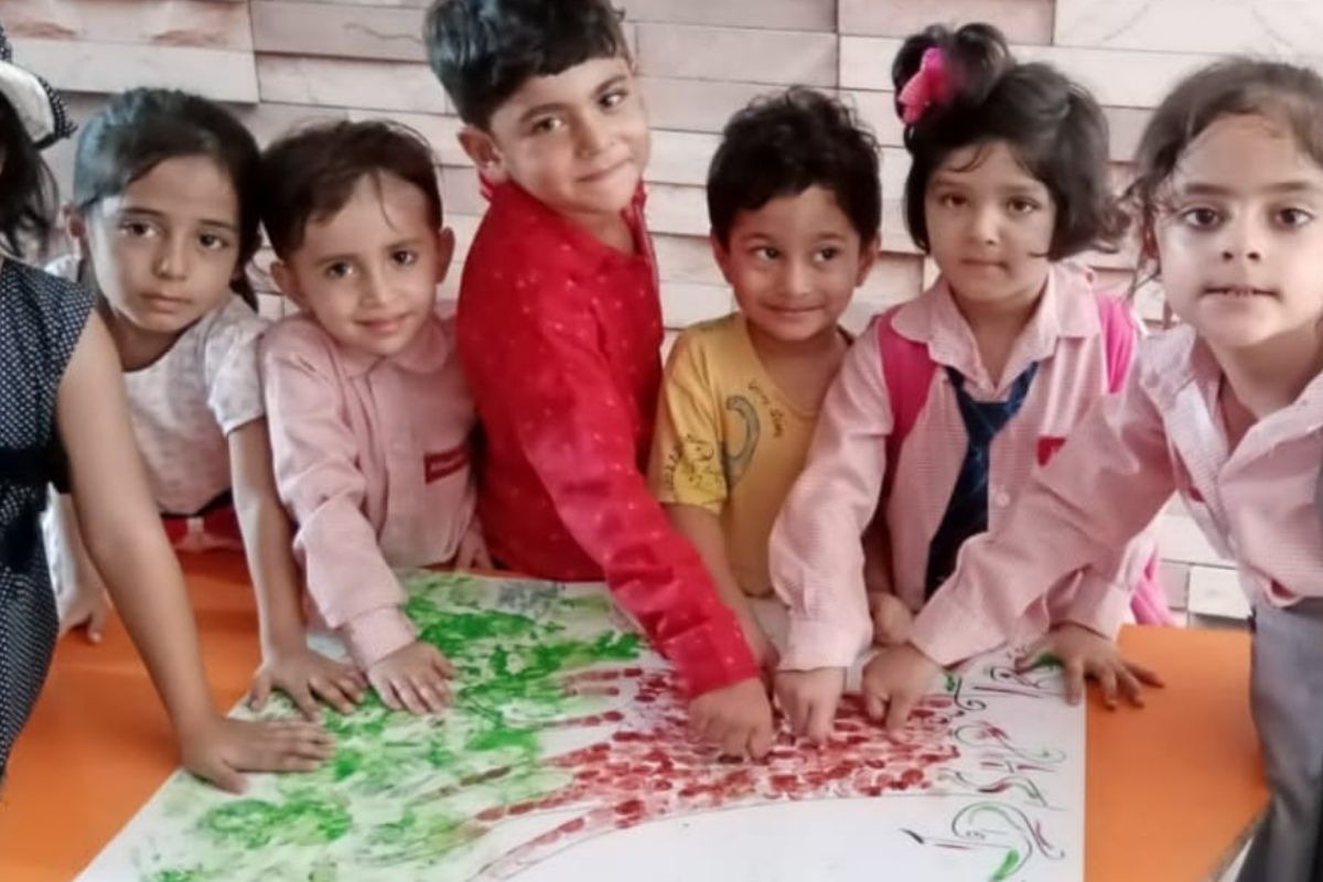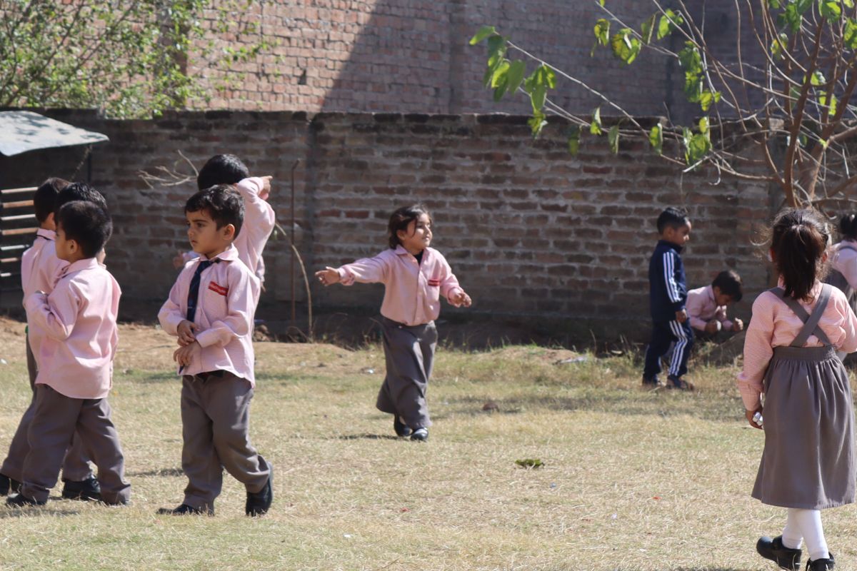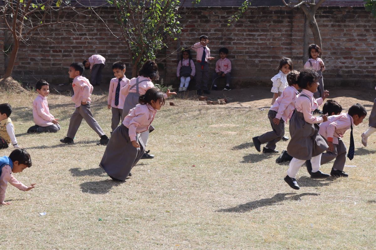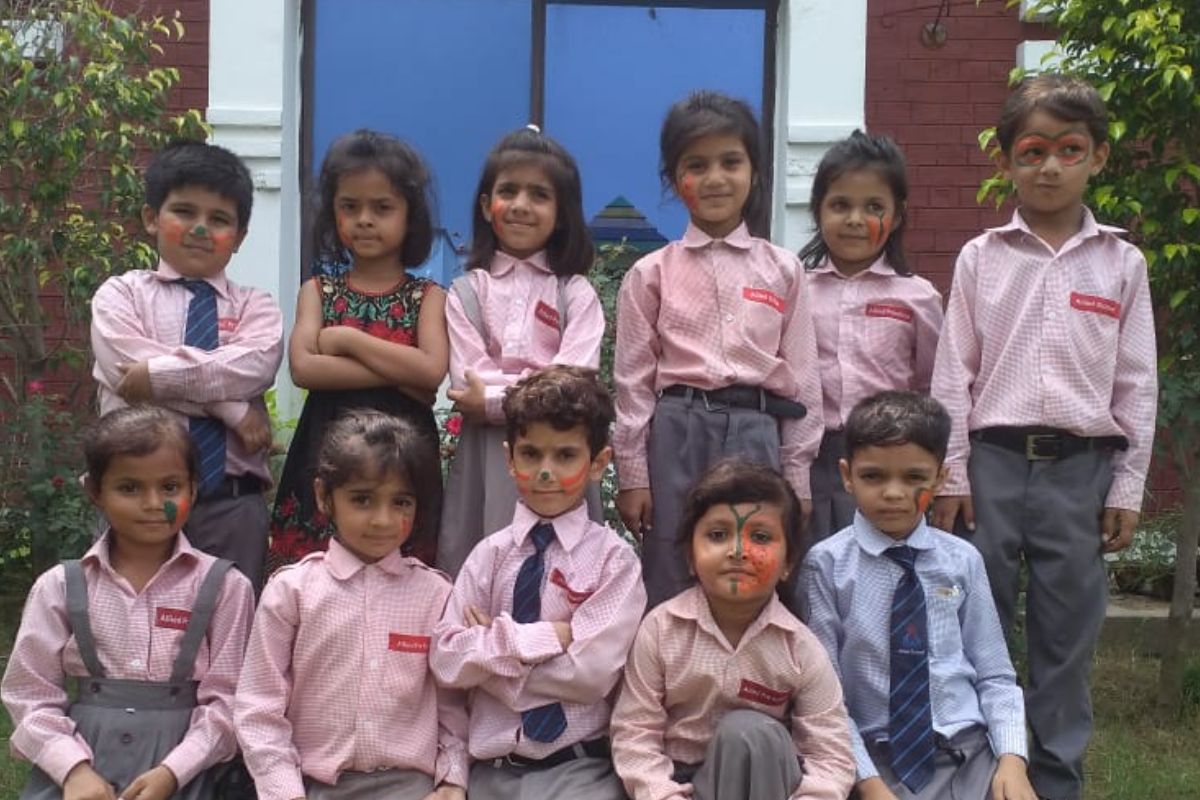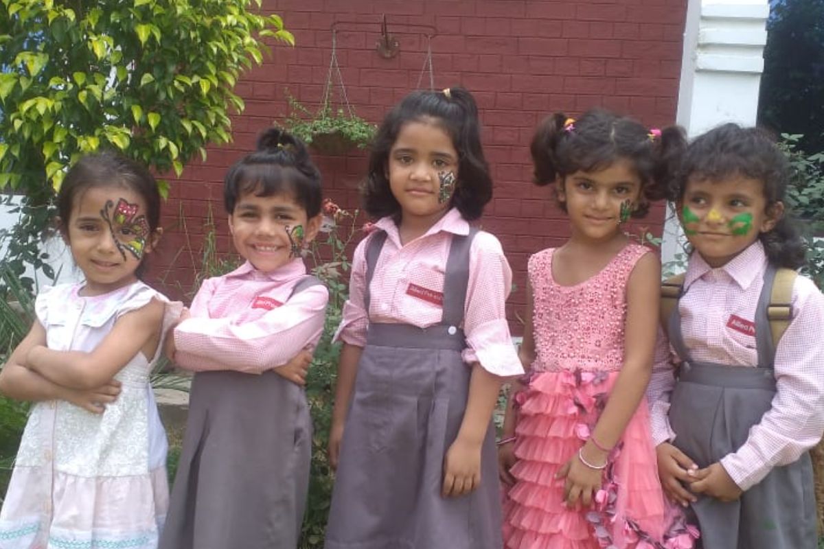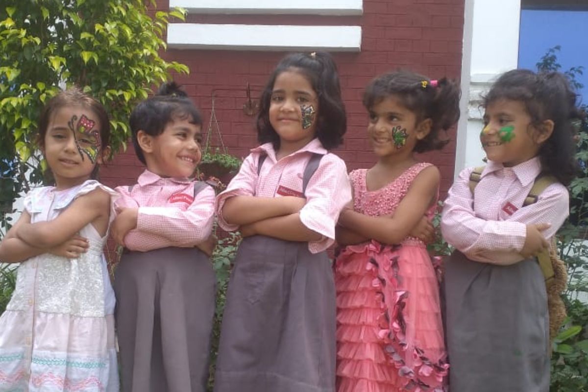Smiling faces . Play group students enjoying in school lush green lawn. This is the age having fun and fun.