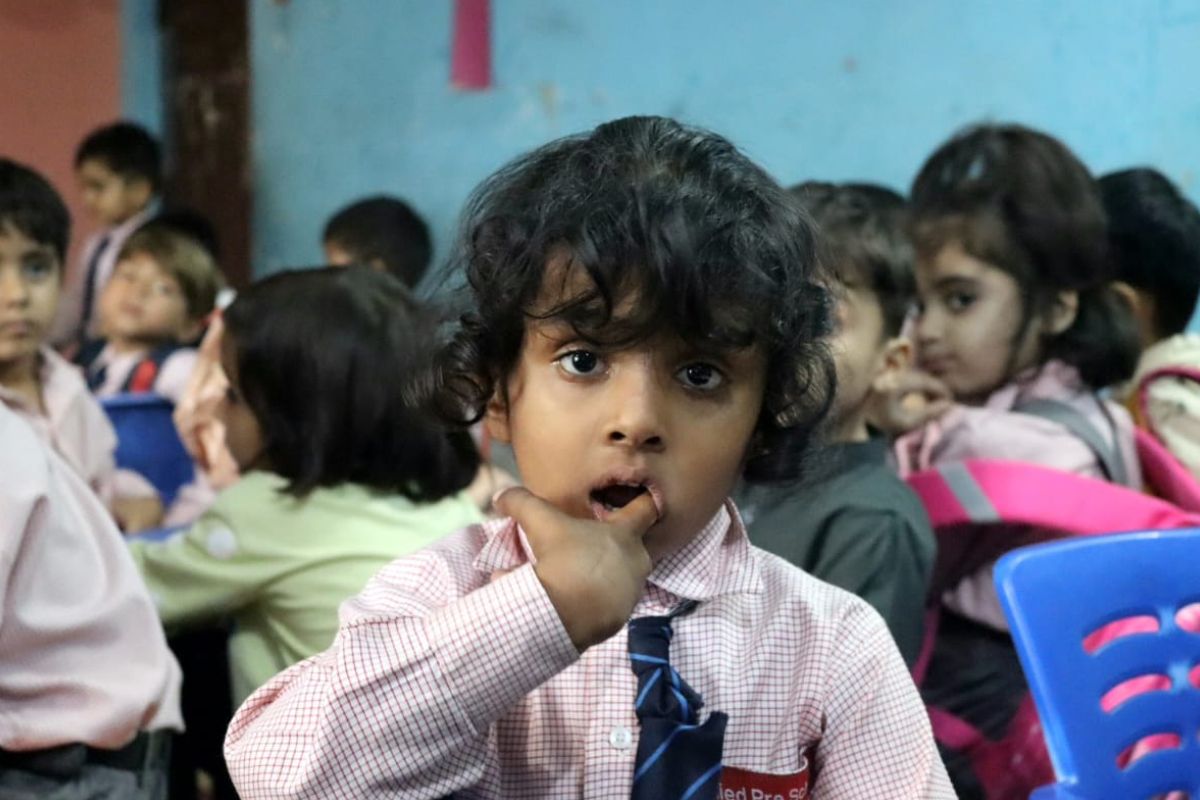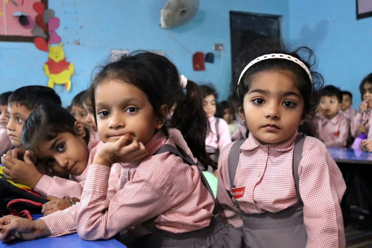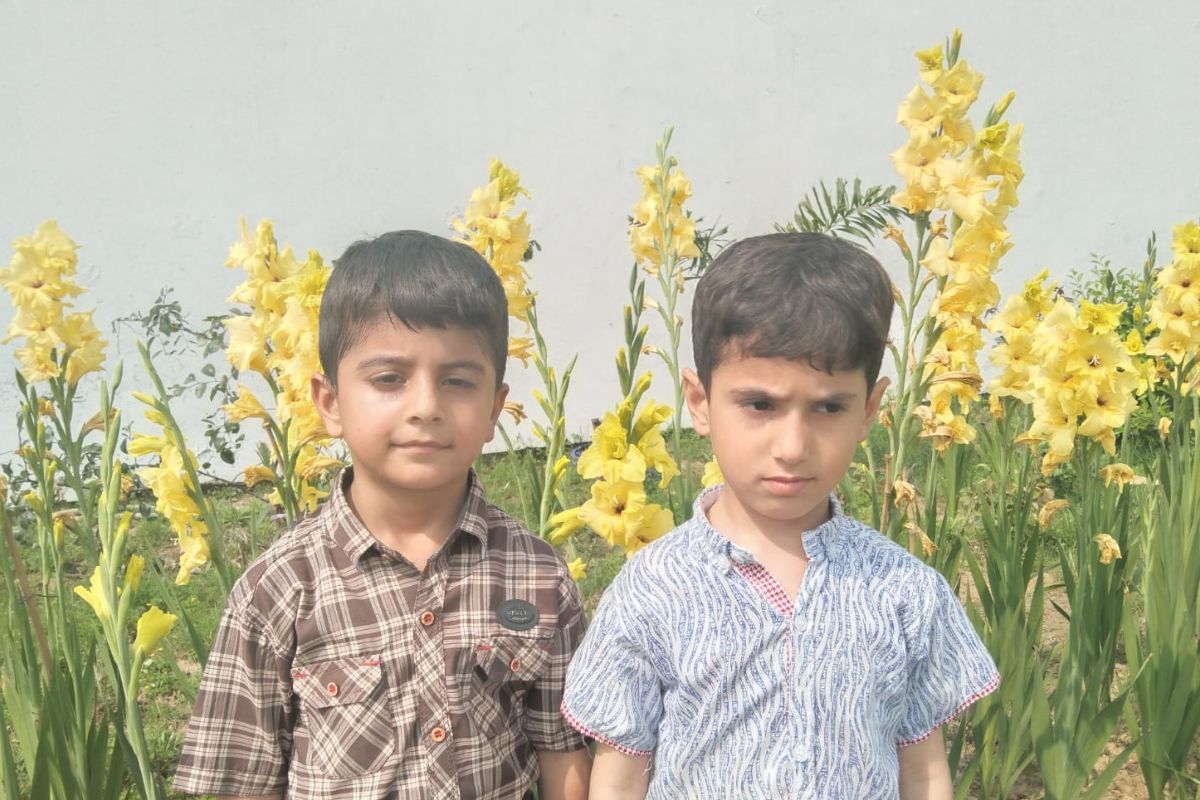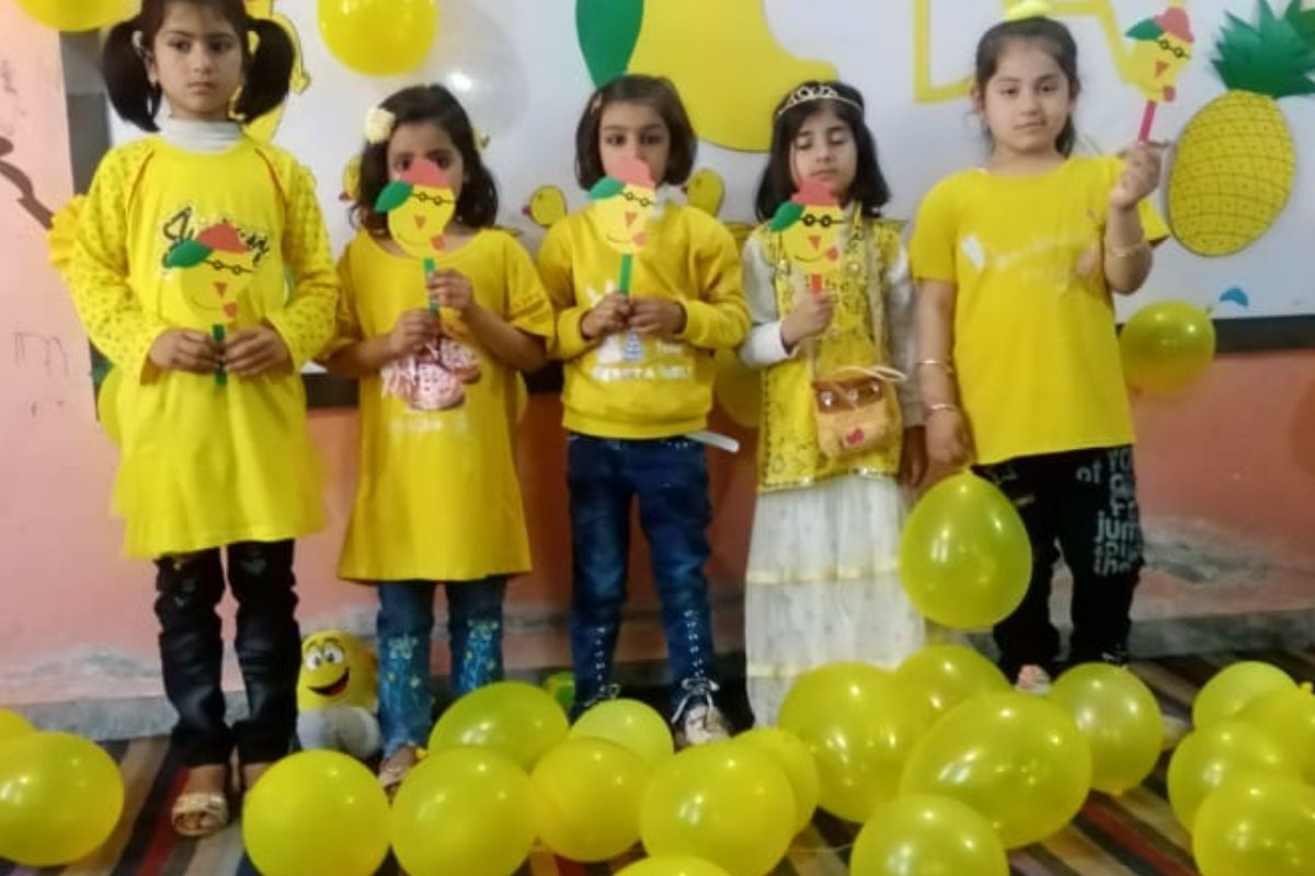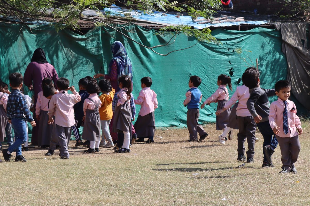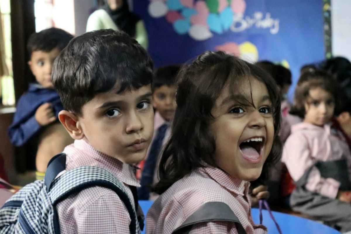 Smiling faces . Play group students enjoying in school lush green lawn. This is the age having fun and fun.